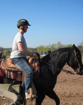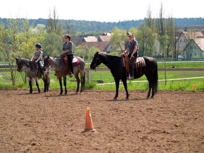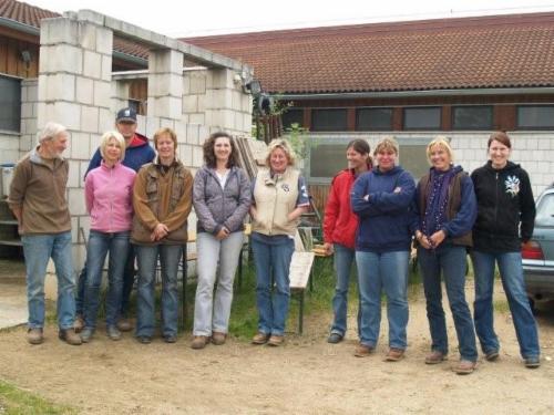 ..insgesamt waren wir so ca. 12 Leute, inclusive vier Behinderter…meinem Mann wurde das Schulpferd geputzt und gesattelt, und auch den anderen wurde geholfen wo Hilfe nötig war…dann ging´s los, warmreiten auf dem grossen Aussenplatz…das war schon toll, mit so vielen Pferden auf einmal…dann wurden 2 Gruppen gebildet, wovon unsere Gruppe auf den anderen Aussenplatz auswanderte…dann ging es so richtig zur Sache, Nachgeben des Kopfes vom Pferd, vertikale Verschiebung , Horsemanshipübungen mit Stangen, mit den hinteren Beinen kreuzen und auch schon der erste Gallop….solange sind wir noch nie am Pferd gesessen, aber die Zeit bis zur Mittagspause verflog sehr schnell…wir wurden alle von der Cheffin des Hauses sehr gut und reichlich verköstigt, Fleisch, Nudeln, Salate und Mengen von Kuchen…nach ausreichernder Pause gings Nachmittag wieder weiter, diesmal blieben beide Gruppen auf dem grossen Aussenplatz…die erste Gruppe machte Reining mit Harald, und unsere Gruppe übte Trail mit Haralds Tochter Marina, der ich auf diesem Weg für ihre Geduld danken möchte…