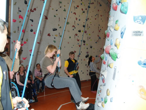 Am meisten faszinierte es mich, als ich TOM die ganzen 14 Meter der Wand habe hochklettern sehen … das letzte Mal habe ich ihn so grinsen sehen nach seinem Fallschirmsprung … wenn man ihn so in der Wand sah, war kaum ein Unterschied zu den vielen anderen Leuten die dort kletterten … manchen wird es sicher verwundert haben, wenn er ihn dann, wieder unten auf seinen Stuhl zuhinken sehen hat…