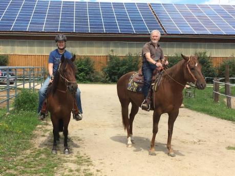 ...so was wollte er doch schon lange mal reiten...Sabine und ich ritten abwechselnd auf einem Pintowallach (Apache), der zugegebener Maßen schon etwas sehr faul war