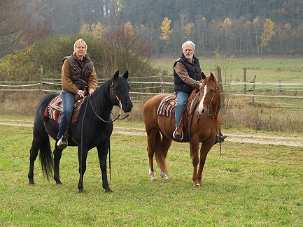 ...hier möchte ich etwas über meine allerliebstes Hobby erzählen,/schreiben, über´s Reiten...als ich 2002 damit anfing war´s eigentlich nur damit die vorhandenen Karten nicht verfallen...meine erste Stunde war auf einem riesigen engl. aufgezäumten Warmblut..es begann damit das ich gar nicht erst richtig auf´s Pferd raufkam...die Reitlehrerin meinte lapidar; wenn ich nicht auf´s Pferd raufkomme, brauch ich gar nicht erst Reiten lernen...das gefiel mir gar nicht, also liess ich erstmal das mit dem Reiten...da ich aber doch schon Feuer gefangen hatte, schaute ich mich nach einer anderen Möglichkeit um...die bot sich dann bei der Rain River Ranch...da ich mich meiner Krankheit ja nicht schämen muss, sprich ich kann ja nix dafür, erzählte ich natürlich gleich von meinen Problemen mit den Beinen und so....der Stallbesitzer meinte das würde den Pferden nix ausmachen wenn die Beine ab und an etwas rumzappeln..und siehe da, tatsächlich war das kein Problem....erst waren nur Logenstunden auf dem Programm, doch bald sollte sich mein Traum erfüllen...ich ritt ganz alleine...die Stunden im Stall wurden mehr und mehr und im Herbst 2003 kauften wir den damals 4 Jährigen Wallach " Hotrod Black Acer"....ein Traum von einem ganz schwarzen Quarter...später gesellte sich dann noch die fuchsfarbene Stute "Miss Toni Quixote" für meinen Schatz dazu...und wie bei Haustiere zu lesen gab´s bald darauf Nachwuchs,"DOCS RHYTHM SALEM"...